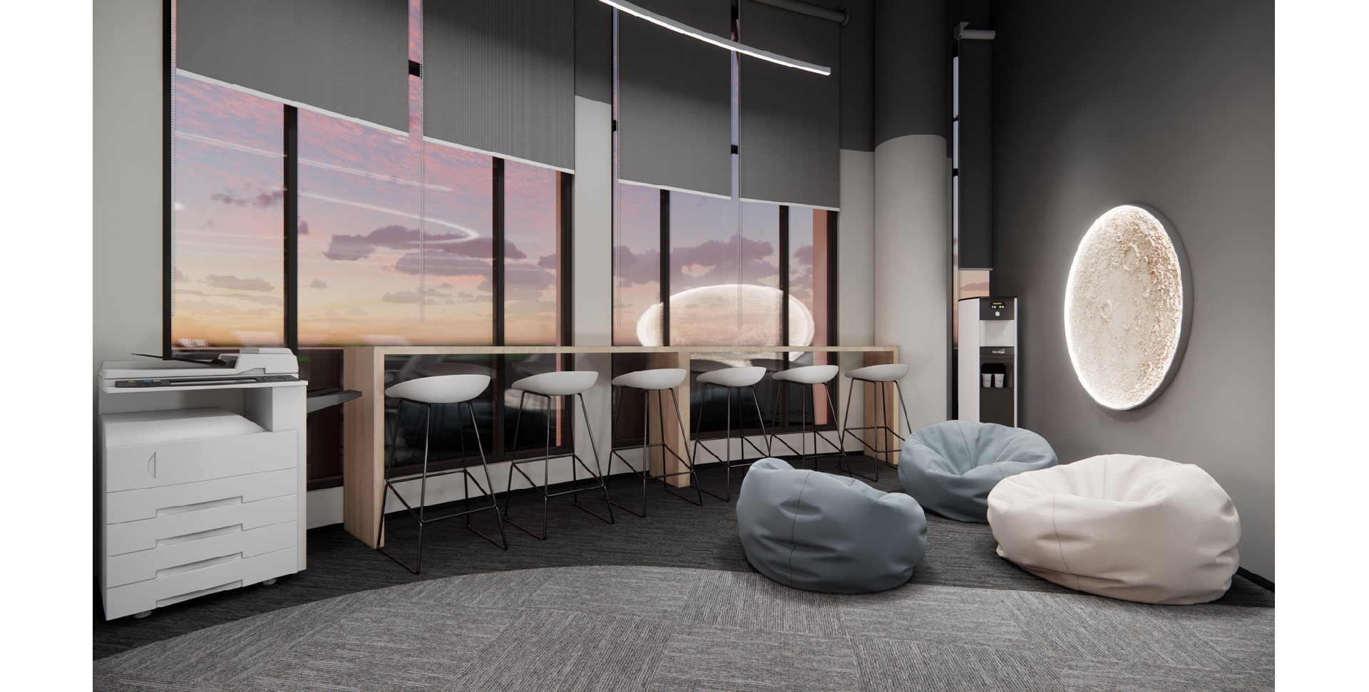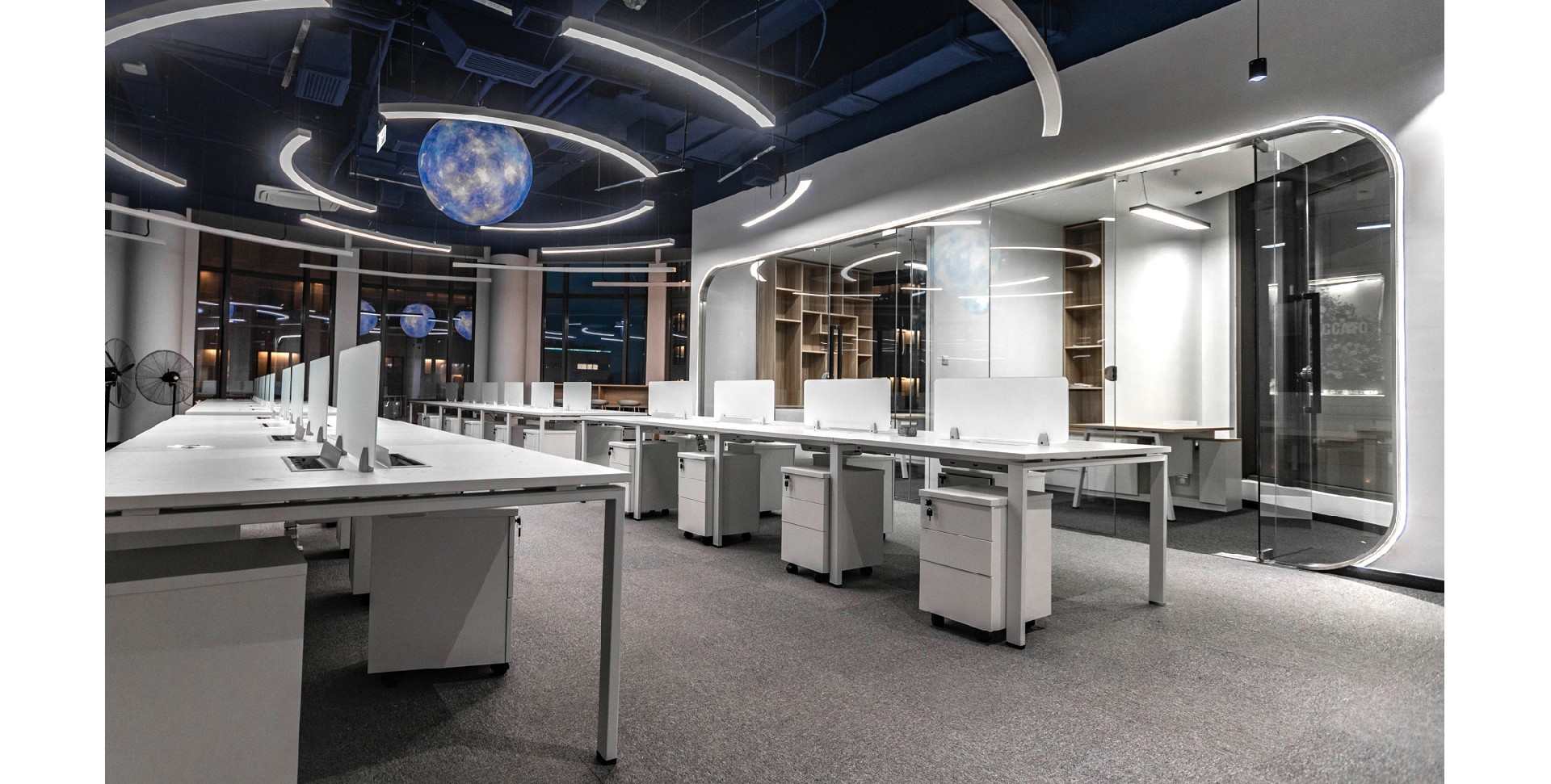 辦公室采用了現(xiàn)代簡約的設(shè)計(jì)風(fēng)格,體現(xiàn)了現(xiàn)代辦公環(huán)境的專業(yè)性和高效性。以白色和深色為主色調(diào),白色代表純潔、明亮,深色則賦予空間穩(wěn)重感。頂部加入行星的科技元素,增加了空間的活力與視覺焦點(diǎn),象征著廣闊與未來。